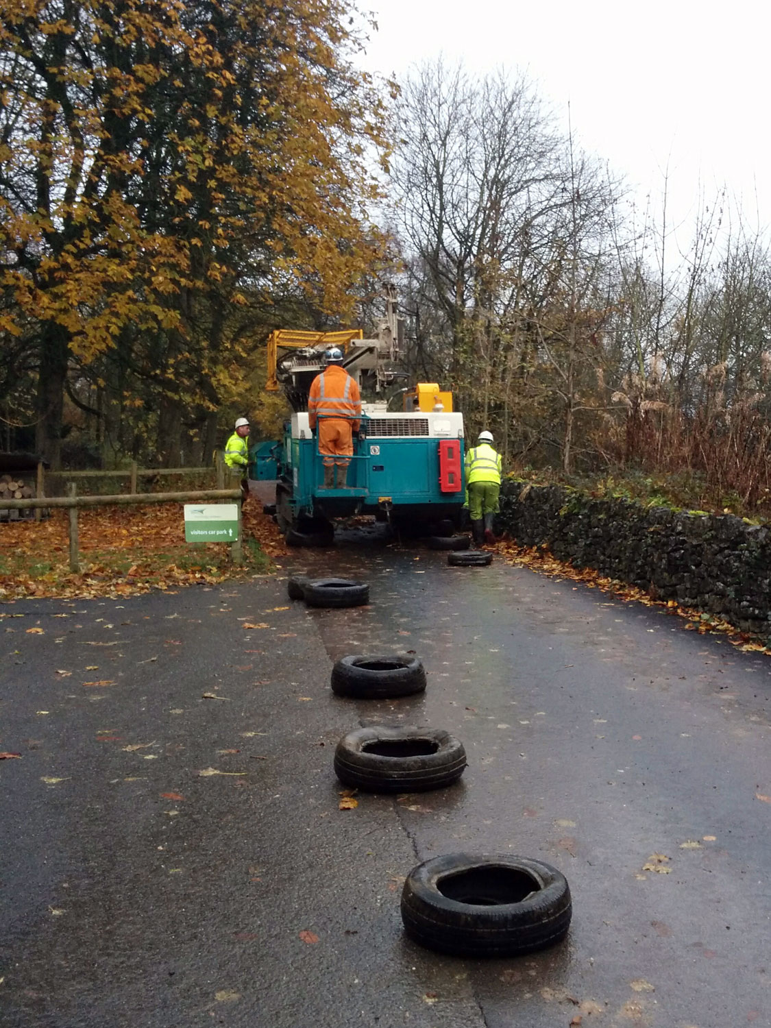 Some great problem solving skills were shown by the ground source heating bore hole drillers – to avoid the metal tracked drill damaging our new back drive a relay of old tyres was laid ahead of the tracks.